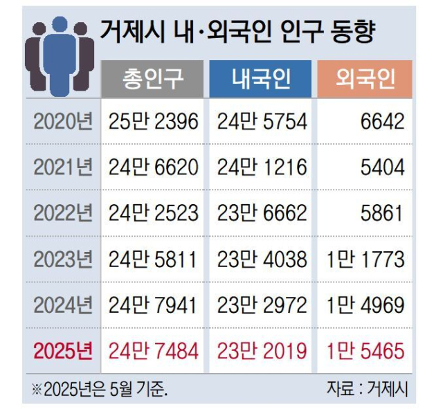 거제경제정의실천시민연합(이하 거제경실련)이 발표한 2025년 1분기 거제 인구 동향을 보면 3월 말 기준 주민등록 인구는 23만 1954명으로 1월(23만 2777명) 대비 826명 줄었다. 저출산 여파로 출생보다 사망이 많은 자연감소 추세가 여전한 데다, 전출이 전입을 초과하는 순유출 현상도 심화한 탓이다.
