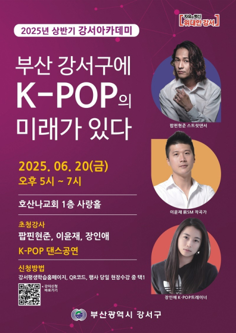 부산 강서구(구청장 김형찬)는 글로벌 K-POP 인재 양성과 문화산업 중심지로서의 입지를 다지기 위해 오는 6월 20일(금) 오후 5시부터 7시까지 호산나교회 1층 사랑홀에서 '2025년 상반기 강서아카데미'를 개최한다고 밝혔다.