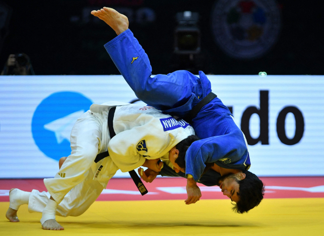 이준환이 16일(현지 시간) 헝가리 부다페스트에서 열린 2025 세계유도선수권대회 남자 81kg급 동메달 결정전에서 우즈베키스탄의 토이이예프를 업어치기로 넘기고 있다. AFP연합뉴스