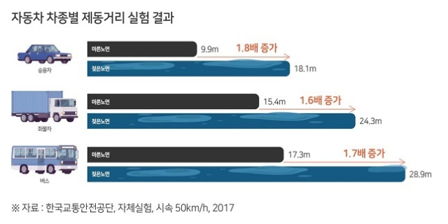 또 화물차의 빗길 제동거리(24.3m)는 마른 노면(15.4m)보다 약 1.6배, 버스의 빗길 제동거리(28.9m)는 마른노면(17.3m)보다 약 1.7배 늘어났다.