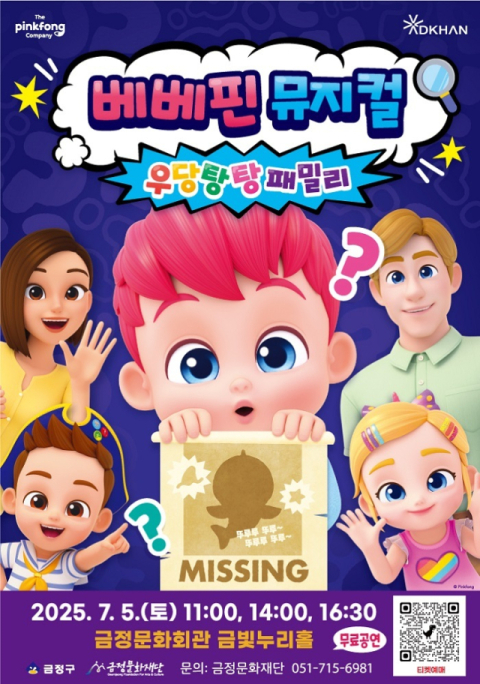 부산 금정구 금정문화재단(이사장 윤일현)이 2025 패밀리콘서트i in 금정 사업의 두 번째 공연으로 아동 동반 가족단위를 대상으로 하는 어린이 뮤지컬 ‘베베핀뮤지컬_우당탕탕 패밀리’ 공연을 개최한다고 밝혔다.