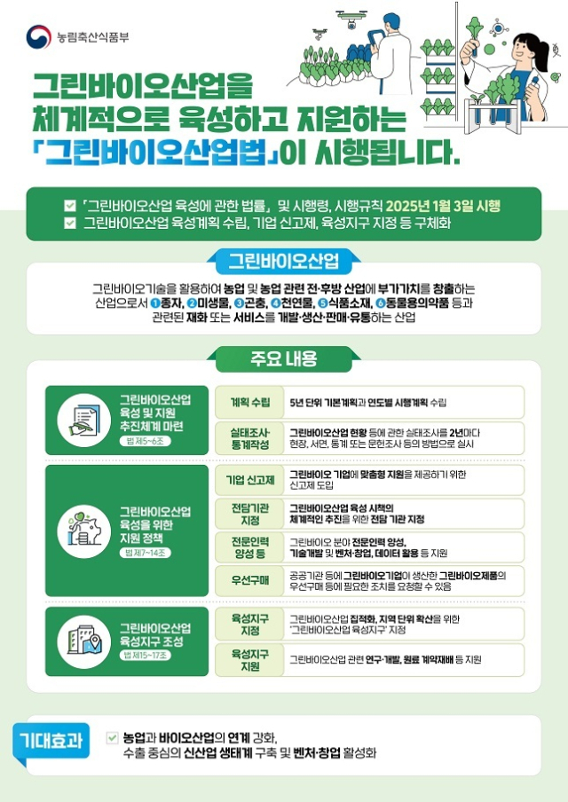 농림축산식품부는 “지역 주도의 그린바이오 산업 기반을 조성하기 위해 ‘그린바이오산업 육성지구’ 지정 절차를 본격 추진한다”고 22일 밝혔다.