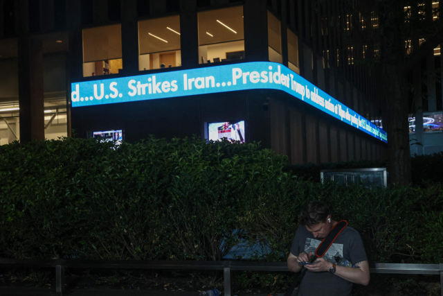 21일(현지시간) 뉴욕에서 폭스 뉴스 티커에 ‘미국의 이란 공습’이 표시돼 있다. AFP 연합뉴스 21일(현지시간) 뉴욕에서 폭스 뉴스 티커에 ‘미국의 이란 공습’이 표시돼 있다. AFP 연합뉴스