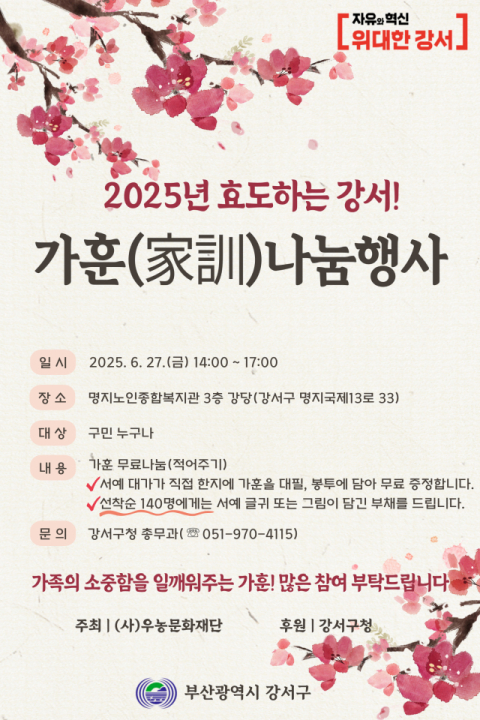 부산 강서구(구청장 김형찬)는 오는 6월 27일, 명지노인종합복지관 3층 강당에서 ‘2025년 효도하는 강서! 가훈 나눔 행사’를 개최한다고 밝혔다.