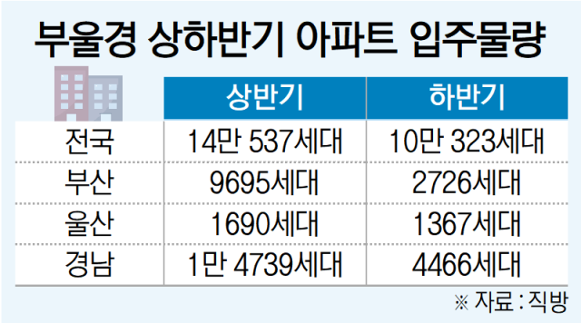 부산은 상반기 9695세대에서 하반기 2726세대로 입주물량이 대폭 감소한다. 울산은 1690세대에서 1367세대로, 경남 역시 1만 4739세대에서 4466세대로 크게 줄어든다. 이에 따라 부울경을 모두 합하면 상반기에 2만 6124세대가 입주한 데서 하반기에는 8559세대로 급감할 예정이다.