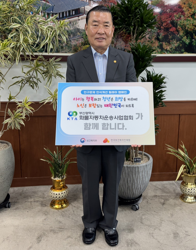 부산시화물자동차운송사업협회 신한춘 이사장이 지난 23일 저출생과 고령화 등 날로 심화하는 인구 문제에 대한 국민적 공감대 형성을 위해 추진 중인 ‘인구 문제 인식 개선 릴레이 캠페인’에 동참했다.