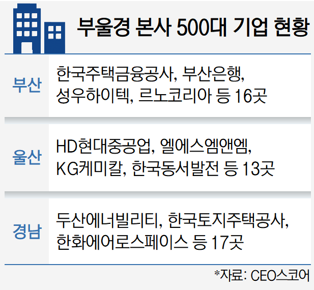 국내 500대 기업 본사 10곳 중 8곳은 서울·인천·경기 등 수도권에 본사가 있다는 분석이 나왔다. 제조업의 메카로 불리는 부울경(부산·울산·경남)에 본사가 있는 500대 기업은 전체의 10% 미만이었다.