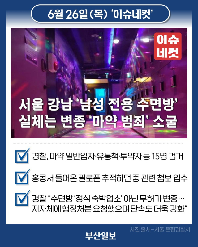 서울 강남권의 남성 전용 수면방을 무대로 마약을 밀반입·유통·투약한 일당 중 15명이 경찰에 붙잡혀 7명이 구속됐습니다. 이번 수사는 지난 4월 검거된 단순 투약자에게 마약을 건넨 유통책을 추적하며 시작됐는데요. 작년 1월부터 올해 5월까지 홍콩에서 필로폰을 속옷에 숨겨 몰래 들여온 피의자가 수사망에 포착됐고, 이 마약이 웹사이트와 앱을 통해 판매돼 서초구 남성 전용 수면방에서 집단 투약·성관계로 이어진다는 첩보도 입수됐습니다. 이에 경찰은 이달 14일 수면방을 압수수색해 유통책과 투약자, 장소제공자 등을 검거한 뒤 범죄수익금 1억6000만원을 기소 전 몰수보전 신청하고 추가 피의자도 추적 중입니다. 경찰은 정식 숙박업소가 아닌 무허가 변종업소로 드러난 수면방에 대한 행정처분을 지방자치단체에 요청한 가운데 "마약 첩보 수집과 단속을 더욱 강화할 것"이라 밝혔습니다.