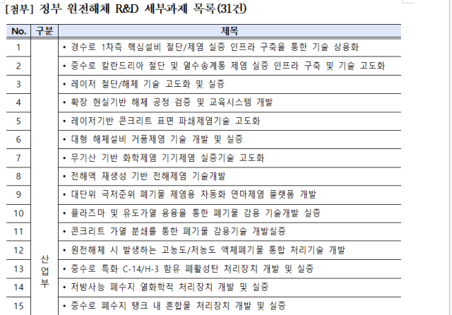 한편, 정부가 2030년까지 진행할 정부 R&D 사업은 총 31개(산업부 24개, 과기정통부 7개)로, △대형 해체설비 거품제염 기술 개발·실증 △원전 해체 시 발생하는 고농도·저농도 액체폐기물 통합 처리기술 개발 △원전해체 현장 방사능 측정시스템 개발·실증 △제염 2차 폐기물 핵종분석기술 개발 △해체부지 불포화대 핵종결합 특성 기반 해체부지 전략수립 및 오염평가 기술 개발 등이다.