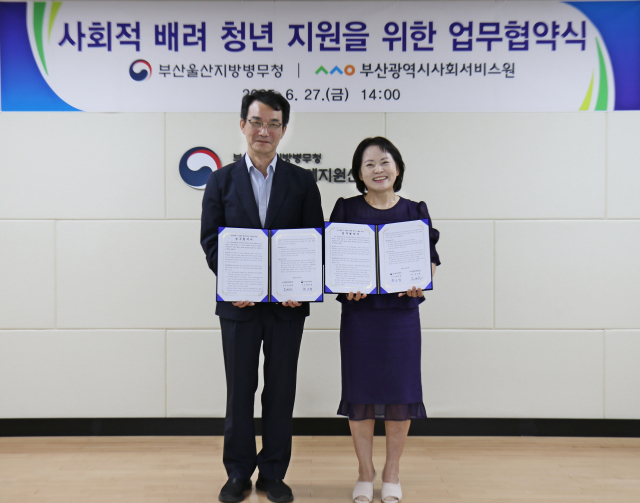 부산울산병무청(청장 한순영)은 27일 복지 사각지대에 놓여 사회적 배려가 필요한 청년의 발굴, 지원을 위해 부산시 사회서비스원(원장 유규원)과 업무협약을 체결했다.