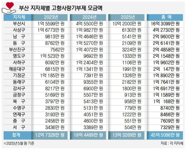 지난해 부산 지역 전체 모금액은 19억 5000만 원으로 2023년(12억 7000만 원)에 비해 1.5배 넘게 늘었지만 정작 지자체에서 활용처를 찾지 못하면서 현재까지 18억 원 가까이 적립된 기금이 갈 길을 못 찾고 있다. 2023년부터 지난해까지 부산시와 16개 구·군이 모금한 32억 1833만 원 중 17억 7565만 원은 올해도 활용 계획 없이 지자체별 별도 계좌에 예치된 상태다.