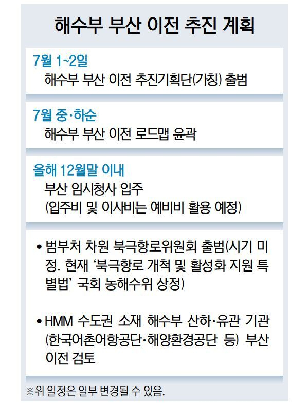 이재명 대통령의 대선 공약인 ‘해양수산부 부산 이전’과 관련, 이재명 정부가 연내 이전을 목표로 드라이브를 걸고 있는 가운데, ‘해수부 부산이전 추진추진단’(가칭)이 이르면 7월 1·2일 출범한다. 해수부가 이재명 정부 국정기획위원회에 2차례의 업무보고를 한 가운데 해수부 부산이전 로드맵은 향후 2~3주 내에 윤곽을 드러낼 전망이다.