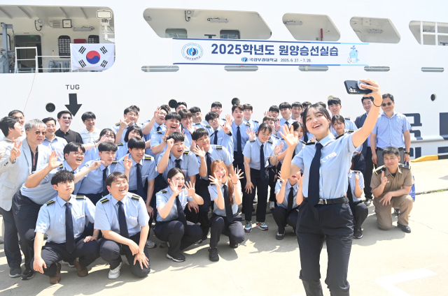 지난달 27일 부산 용호만 매립부두에서 국립부경대 학생 74명과 승무원 30명이 32일간 원양승선실습을 위해 ‘백경호’ 출항 전 사진 촬영을 하고 있다. 국립부경대 제공