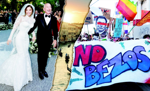 베네치아의 여론이 둘로 쪼개지는 일이 벌어졌다. 아마존 창립자이자 2150억 달러(293조 원)의 자산을 보유한 ‘세계 3위 갑부’ 제프 베이조스가 지난달 26~28일(현지 시간) 사흘간 베네치아에서 폭스 TV 앵커 출신인 약혼녀 로런 산체스와 초호화 결혼식을 올린 것이 발단이었다. 결혼식에는 마이크로소프트 창업자인 빌 게이츠, 배우 레오나르도 디카프리오, 방송인 오프라 윈프리, 모델 킴 카다시안, 도널드 트럼프 미국 대통령의 딸 이방카 트럼프와 사위 재러드 쿠슈너 등 200여 명의 세계 유명 인사들이 참석했다. 인근 공항 3곳에 전용기 90대, 베네치아 대운하에 수상 택시 30여 대가 동원됐고, 하객들은 최고급 호텔 5곳에 나눠 숙박했다. 결혼식 비용만 최소 4000만 유로(640억 원)에 달했다.