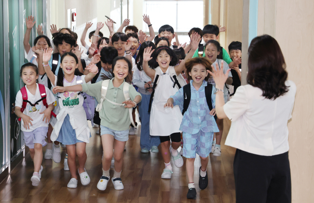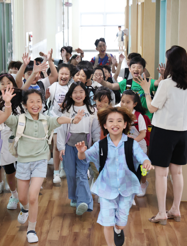1일 부산 기장군 해빛초등학교에서 여름방학식을 가진 3학년 학생들이 즐거운 표정으로 선생님과 인사를 하며 교실 문을 나서고 있다.