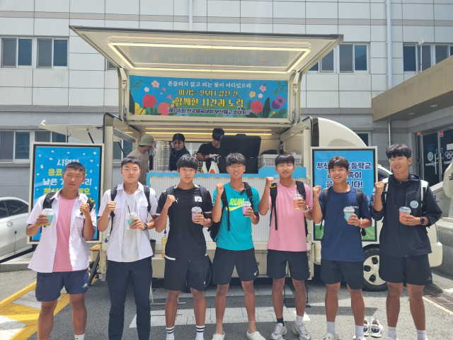부산체육고등학교(교장 곽정록)는 지난 2일 제106회 전국체육대회 개최 100일을 앞두고, 필승을 기원하며 학생들과 교직원에게 시원한 음료수를 제공하는 푸드트럭 행사를 진행했다.