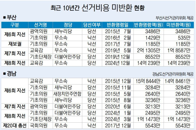 지난 10년간 부산·울산·경남 지방선거·총선에서 위법 행위로 형이 확정된 출마자가 국가에 반환하지 않은 선거 비용이 40억 원을 넘는 것으로 나타났다. 선거관리위원회도 이 같은 사실을 인지하고 있지만 뚜렷한 회수 방법이나 법적 장치가 없어 제도 개선이 시급하다는 지적이 제기된다.