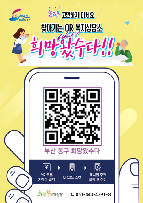 부산 동구(구청장 김진홍)는 복지 위기가구를 적극적으로 발굴하고 지원하기 위해 이달부터 비대면 찾아가는 QR상담소 ‘희망왔수다’ 사업을 운영한다고 밝혔다. 특히 혹서기 기간 동안 집중적으로 추진할 예정이다.