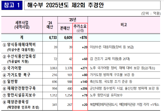해양수산부는 2025년도 제2회 추가경정예산(이하 추경)이 876억 원 규모로 확정됐다고 4일 밝혔다.