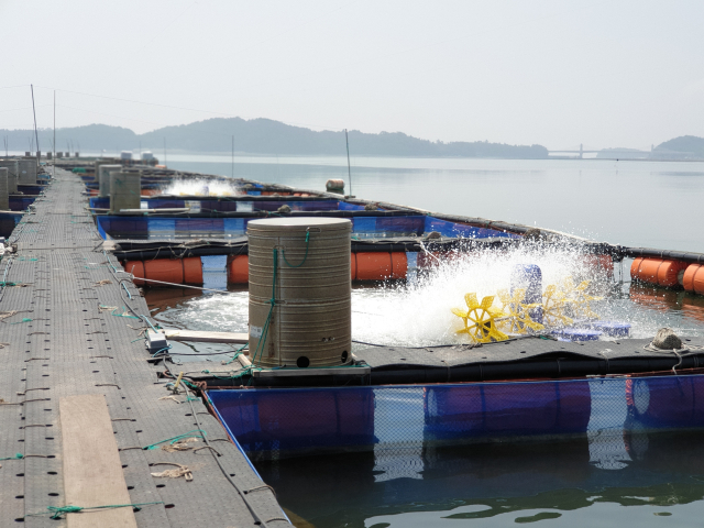 고수온 피해 예방을 위해 양식장에 수차(산소공급) 시설을 가동 중인 모습. 부산일보DB