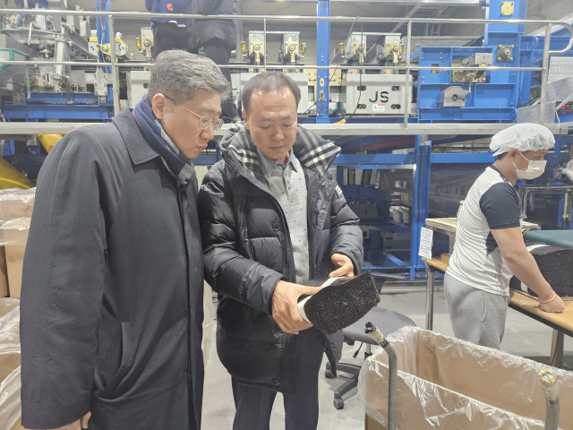 해양수산부 홍래형(왼쪽) 수산정책관이 지난 1월 14일 진도군 수품항을 방문해 마른김 가공 현장을 점검하는 모습. 해수부 제공