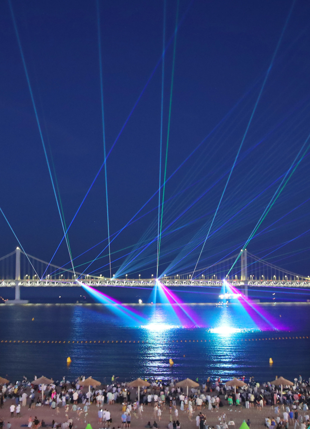 ‘빛과 바다의 도시, 부산’을 주제로 한 ‘광안리 레이저쇼’가 5일 오후 부산 광안리 밤바다를 수놓고 있다. 부산 수영구는 이날 광안리 드론쇼와 처음으로 연계한 레이저쇼를 내년부터 상설화해 대표 야간관광 콘텐츠로 발전시켜 나갈 계획이다.