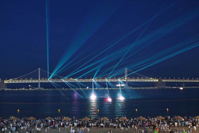 곧이어 배경 음악이 웅장하게 깔리자, 이번에는 광안대교에서 레이저가 하늘과 바다로 뻗어나갔다. 세계 최초로 드론쇼에 이어 선보이는 이번 레이저쇼는 ‘빛과 바다의 도시 부산’을 주제로 18분간 진행됐다. 레이저를 받아 바다 곳곳이 반짝이자, 해변 곳곳에서는 “멋지다”며 함성과 박수가 쏟아졌다. 음악의 리듬에 맞춰 푸른 빛, 보라 빛, 흰색 빛의 광선이 서로 교차하며 관객의 눈을 사로잡았다.