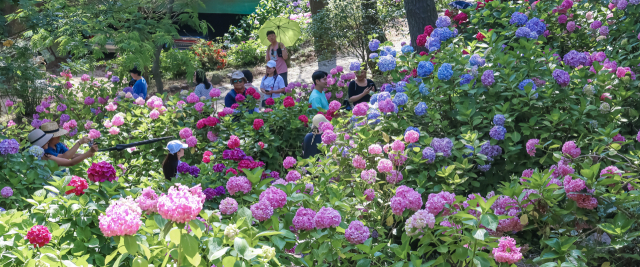 영도 수국꽃 문화축제가 열린 6일 부산 영도구 태종대 수국 군락지에서 관광객들이 활짝 핀 수국을 감상하고 있다. 13일까지 열리는 수국 축제는 코로나 팬데믹에 이어 가뭄으로 꽃의 생육 상태까지 나빠져 중단됐다가 5년 만에 다시 개최됐다.