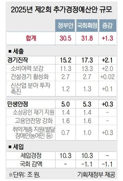 사업별로는 민생 회복 소비쿠폰이 12조 2000억 원으로 가장 큰 비중을 차지했다. 그 밖에 △장기연체채권 소각 프로그램(4000억 원)을 비롯한 소상공인 지원 1조 4000억 원 △건설 경기 활성화 1조 3000억 원 △국민취업 지원(2000억 원) 등 고용 안정 1조 원 등이다.