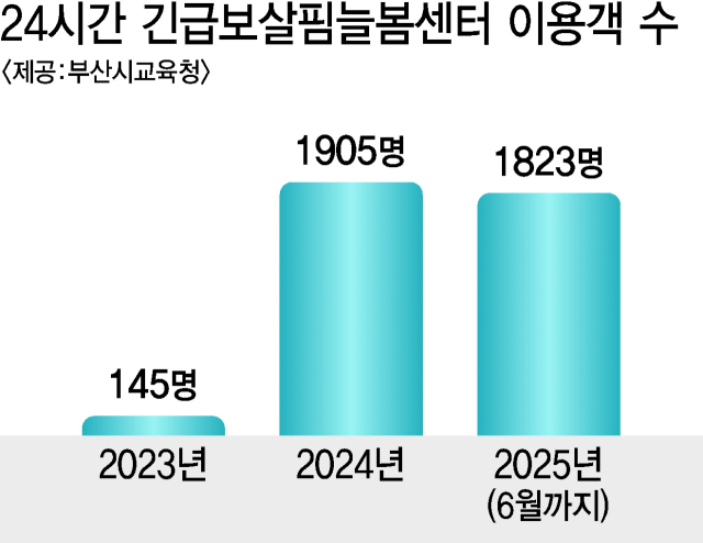 6일 부산시교육청에 따르면 ‘24시간 긴급보살핌늘봄센터’는 부산 13개 구에 29곳 운영 중이다. 그러나 실제 24시간 돌봄이 가능한 곳은 시교육청 소재 늘봄센터 1곳 뿐이다. 나머지 센터는 대부분 오후 6~10시만 운영한다. 이들 늘봄센터 중 16곳은 지난달 이용자가 0명이었다. 연간 운영에 예산 7060만 원을 투입하지만, 지난해 1905명이 이용하는 데 그쳤다. 부산 유아부터 저학년 아동(0~9세) 17만 5221명의 1.09%에 불과하다. 24시간 돌봄이 가능한 시교육청 늘봄센터도 최근 3개월간 오후 11시 이후 이용자는 단 한 명도 없다. 사전에 신청해야 이용이 가능한 불편한 점이 있는 데다, 홍보 부족으로 학부모들에겐 늘봄센터 자체가 여전히 낯설기만 하다.