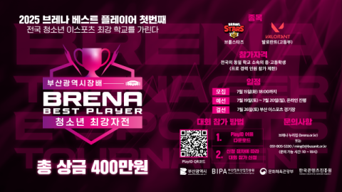 부산광역시(시장 박형준)와 부산정보산업진흥원(원장 김태열)은 부산이스포츠경기장(이하 브레나)에서 ‘2025 브레나 베스트 플레이어’ 대회를 총 4회에 걸쳐 개최한다고 밝혔다. 대회는 청소년부를 시작으로 대학생부, 직장인부, 일반부 순으로 연말까지 순차적으로 진행될 예정이다.