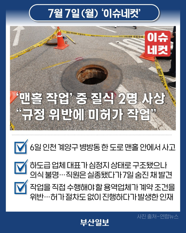 지난 6일 오전 9시 20분께 인천시 계양구 병방동 도로의 맨홀 안에서 2명의 사상자가 발생했습니다. 오·폐수 관로 조사·관리 업체 대표가 심정지 상태로 구조됐지만 의식을 찾지 못하고 있고, 같이 작업에 나섰다가 실종된 직원은 7일 오전 끝내 숨진 채 발견된 것인데요. 이번 사고는 작업을 직접 수행해야 할 용역업체가 계약 조건을 위반한 상황에서 허가 절차도 없이 진행하다가 발생한 인재로 드러나고 있습니다. 노동당국은 산업안전보건법 및 중대재해처벌법 위반 여부 조사에 착수한 가운데, 경찰은 지하 관로에서 황화수소와 일산화탄소 등이 확인된 점을 토대로 이들이 유독가스에 중독된 것으로 보고 구체적인 사고 경위를 조사할 예정입니다.