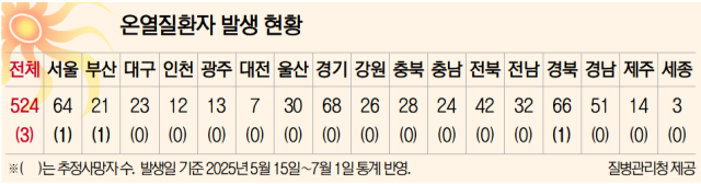 7일 질병관리청의 온열질환 응급실 감시 체계에 따르면 지난 5월 15일∼7월 1일 신고된 온열질환자는 사망자 3명을 포함해 총 524명이었다. 올해 온열질환자는 지난해 같은 기간(사망 2명 포함 390명)의 1.34배다. 올해 온열질환 10건 중 8건 정도는 실외(84.9%)에서 발생했다. 실외 중에서는 작업장(26.0%)이 가장 많았으며, 길가(17.2%), 논밭(17.0%) 등의 순이었다. 연령별로는 65세 이상이 전체 환자의 30.5%를 차지했다.