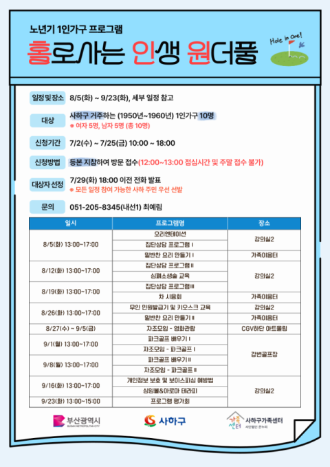 참가자 모집은 1950~1960년생 사하구 거주 1인가구를 대상으로 7월 2일부터 7월 25일까지 진행되며, 사하구가족센터를 직접 방문해 신청할 수 있다. 신청 시 등본을 지참해야 한다.