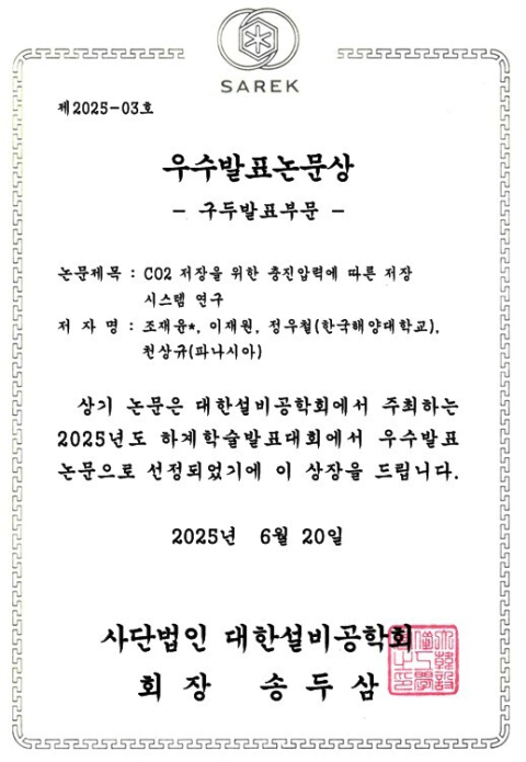 국립한국해양대학교 에너지&환경 시스템 실험실(지도교수 이재원) 소속 조재윤 대학원생은 사단법인 대한설비공학회에서 주최한 전국규모의 2025년 하계학술발표대회에서 ‘CO2 저장을 위한 충진압력에 따른 저장 시스템 연구’를 주제로 우수 발표 논문상을 수상했다.