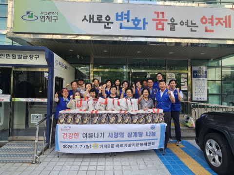 부산 연제구 거제2동 바르게살기운동위원회(위원장 신성희)는 지난 7일 동 행정복지센터 앞에서 ‘사랑의 삼계탕 나눔’ 행사를 열었다.