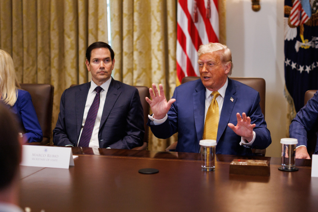 도널드 트럼프 미국 대통령(오른쪽)과 마르코 루비오 미국 국무장관이 8일(현지시간) 미국 워싱턴 DC 백악관 내각실에서 열린 내각 회의에 참석하고 있다. EPA 연합뉴스