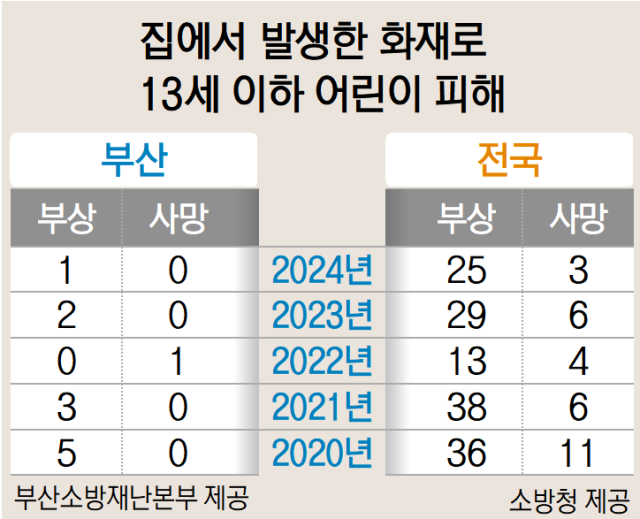 9일 부산소방재난본부에 따르면 부산에선 최근 5년(2020~2024년)간 화재로 13세 이하 어린이 11명이 다쳤고 1명이 사망했는데, 이들은 모두 집에서 다치거나 숨졌다. 전국 상황도 마찬가지다. 소방청의 ‘국가화재정보시스템’에 따르면 같은 기간 화재로 사망한 13세 이하 어린이는 30명인데 모두 집에서 변을 당했다.