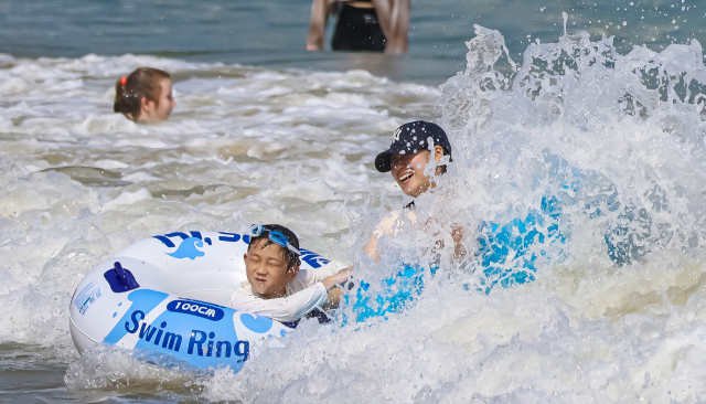 무더위가 이어진 9일 부산 수영구 광안리 해수욕장을 찾은 관광객들이 해수욕을 즐기고 있다. 김종진 기자 kjj1761@