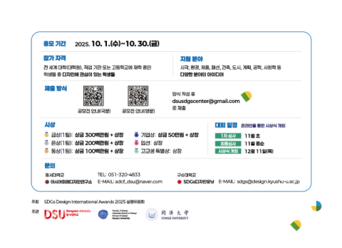 동서대학교(총장 장제국)는 일본 큐슈대학교, 중국 동제대학교와 공동 주관으로 ‘SDGs Design International Awards 2025’ 공모전을 개최한다고 10일 밝혔다.