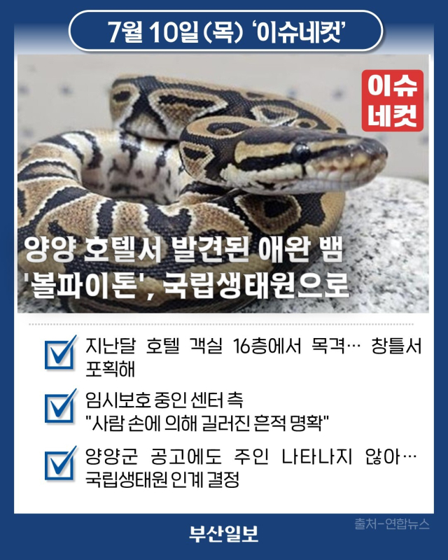 지난달 강원 양양의 호텔에서 발견된 국제 멸종위기종 '볼파이톤'이 국립생태원 보호를 받게 됐습니다. 양양소방서 등에 따르면 지난달 16일 오후 5시께 양양의 한 호텔 객실 16층에서 뱀이 발견됐다는 신고가 접수됐습니다. 출동한 소방대원은 창틀 사이에 웅크리고 있던 뱀을 포획했습니다. 이 뱀은 몸길이 약 50cm에 노란색과 검은색 무늬가 섞인 모양으로, 주로 아프리카에 서식하는 볼파이톤으로 나타났습니다. 현재는 국립공원 야생생물보전원 북부보전센터에서 임시보호 중으로, 센터 측은 "사람 손에 의해 길러진 흔적이 명확하다"고 밝혔습니다. 볼파이톤은 세계적 멸종위기종이지만 성격이 비교적 온순하고 사육이 쉬워 국내에선 반려동물로 키우기도 하는 것으로 알려졌습니다. 이 뱀은 양양군에서 6월 16일부터 10일간 공고했으나, 소유자가 나타나지 않아 오는 11일 국립생태원으로 인계가 결정됐습니다.
