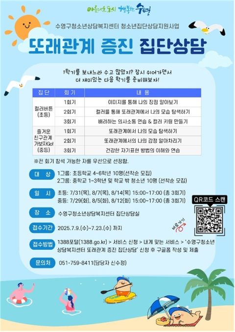 부산 수영구(구청장 강성태)는 수영구청소년상담복지센터(센터장 탁희욱)에서 오는 7월 29일부터 8월 14일까지 초등학교 고학년, 중학생 및 학교 밖 청소년을 대상으로 ‘또래관계 증진 집단상담’을 운영한다고 밝혔다.