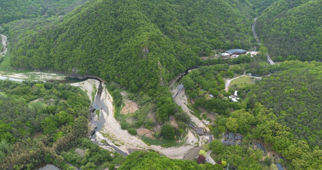 반구대 암각화를 품은 대곡천. 대곡천은 전형적인 감입곡류(嵌入曲流)형 하천으로 높은 산 사이사이를 뱀처럼 구불구불 흘러간다. 울산시 제공