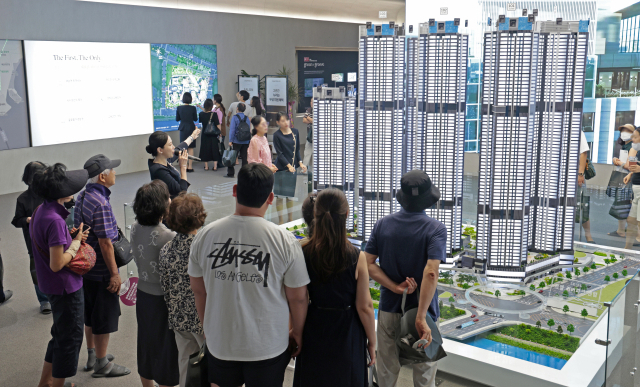 지난 11일 '르엘 리버파크 센텀' 견본주택 방문객들이 조감도 모형을 살펴보고 있다. 르엘 센텀은 지역 부동산 경기의 바로미터로 평가받는다. ▶관련 기사 2면 정대현 기자 jhyun@