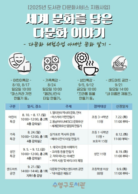 부산 수영구도서관(구청장 강성태)은 문화체육관광부 주관 공모사업 ‘2025년 도서관 다문화 서비스 지원사업’에 선정되어 8~9월 지역 주민을 대상으로 상호 문화 이해를 위한 도서관 다문화 프로그램 ‘세계 문화를 담은 다문화 이야기’ 프로그램을 운영한다고 밝혔다.