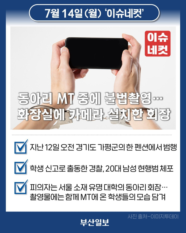 지난 12일 오전 4시께 경기도 가평군의 한 펜션에서 같은 대학 동아리원들을 불법 촬영한 20대 남성 A 씨가 성폭력범죄의 처벌 등에 관한 특례법상 카메라 등 이용촬영 혐의로 경찰에 불구속 입건됐습니다. 당시 펜션 화장실에 휴대전화가 거치된 것을 수상하게 여긴 학생들의 신고로 출동한 경찰은 A 씨의 휴대전화에서 촬영물을 확인하고 그를 현행범으로 체포했는데요. A 씨는 서울 소재 유명 대학의 동아리 회장으로, 촬영물에는 함께 MT에 온 학생들의 모습이 담긴 것으로 알려졌습니다. 경찰은 A 씨의 휴대전화에 대해 포렌식 작업을 진행하며 구체적인 사건 경위를 조사 중입니다.