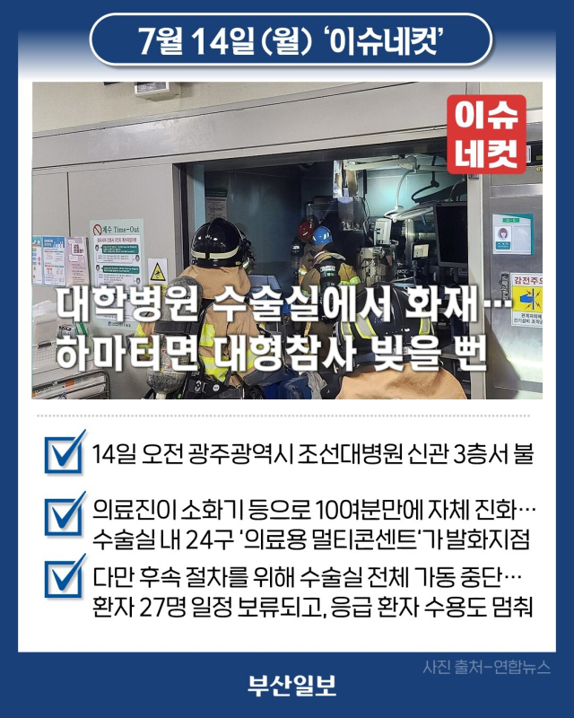 광주·전남 상급종합병원인 조선대학교병원 신관 3층에서 14일 오전 8시 10분께 불이 일어났습니다. 이날 화재는 수술실에서 사용하는 각종 의료기기의 전원을 연결할 수 있도록 한 24구 '의료용 멀티콘센트'에서 시작됐는데요. 다행히 당시 일부 직원이 비상벨을 누르고 소화기로 신속하게 진화작업을 벌이면서 큰 화재로 번지지 않고 10분 만에 진화됐습니다. 다만 이날 화재로 병원 측은 후속 절차인 안전 점검, 무균화 작업 등을 위해 수술실 15개의 전체 가동을 일시 중단했습니다. 이에 수술실에 들어갈 예정이었던 환자 27명의 일정이 전면 보류됐고, 긴급한 수술이 필요한 응급환자들의 수용도 중단됐습니다.