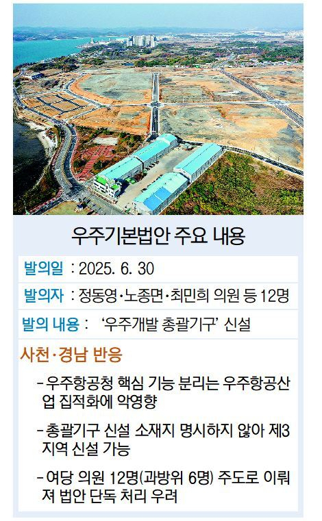 하지만 경남도와 사천시도 모르는 사이 법안이 발의되고 입법 예고 기간에 들어가자 이를 보는 지역 여론은 싸늘하다. 가장 논란이 되는 건 우주항공청 산하에 ‘우주개발총괄기구’라는 법인을 신설하는 내용을 담고 있는 법안 제9조다.