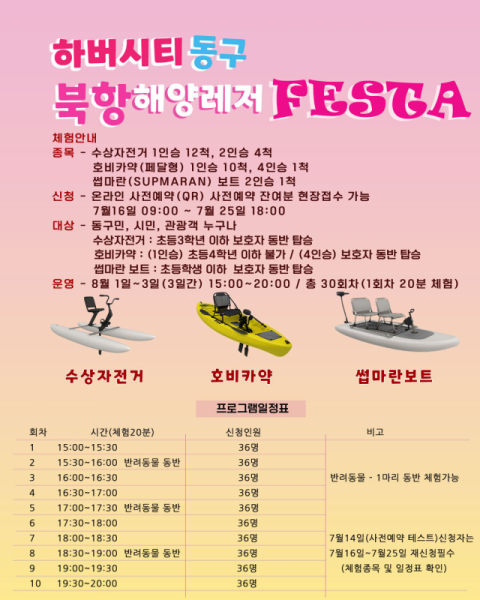 김진홍 동구청장은 “도심 한가운데에서 즐기는 친환경 해양레저 체험은 동구만의 차별화된 관광자원”이라며 “앞으로도 북항 일원을 활용한 다양한 해양문화 프로그램을 지속 발굴해 지역 관광 활성화에 기여하겠다”고 말했다.