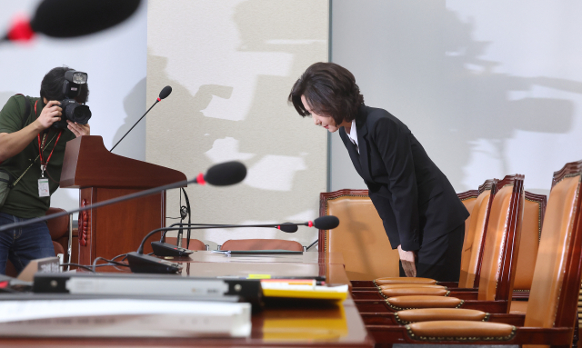 이진숙 사회부총리 겸 교육부 장관 후보자가 16일 서울 여의도 국회 교육위원회에서 열린 인사청문회에서 발언을 마친 뒤 인사하고 있다. 연합뉴스